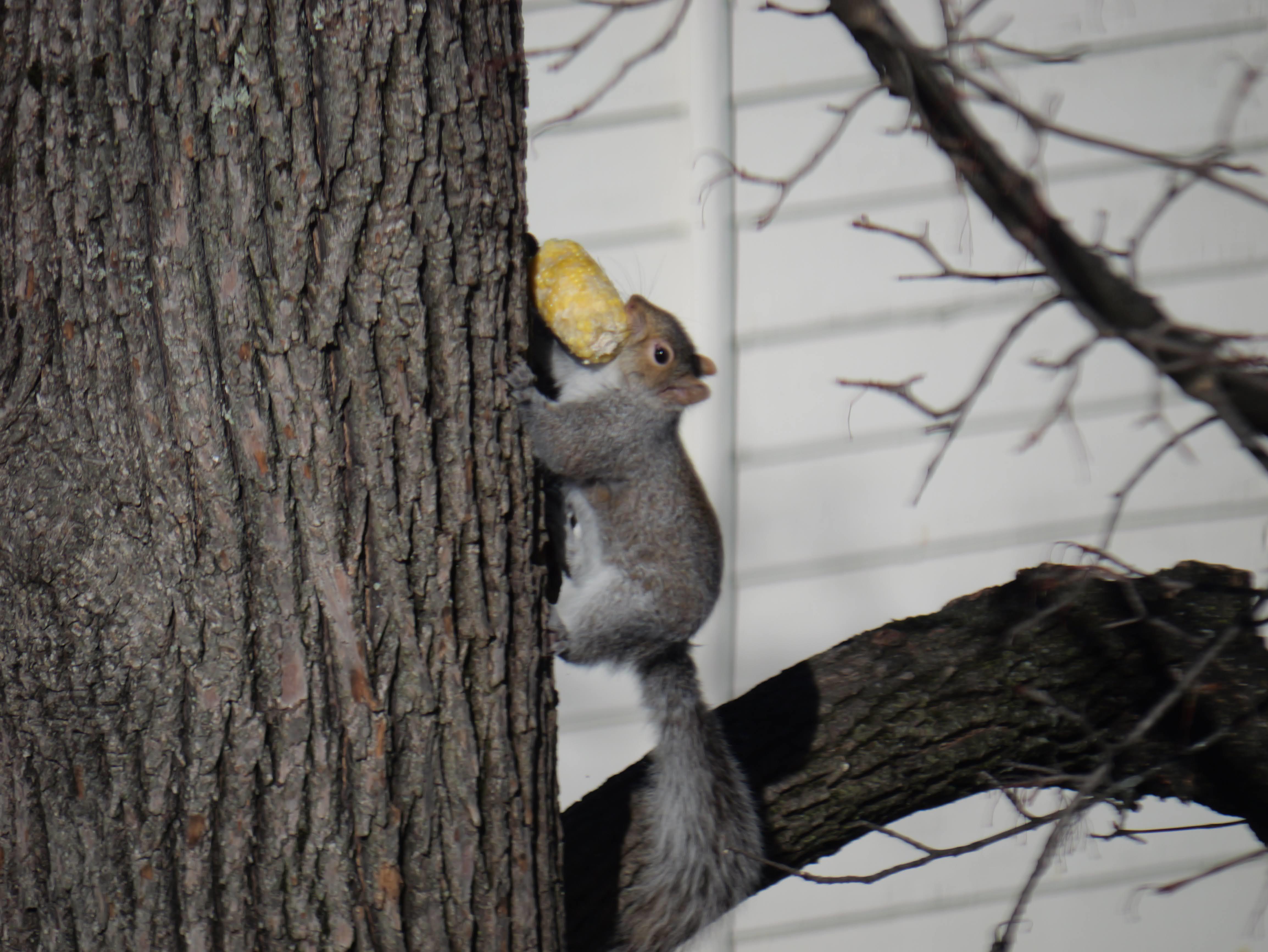 A squirrel climbs a tree holding an ear of corn.