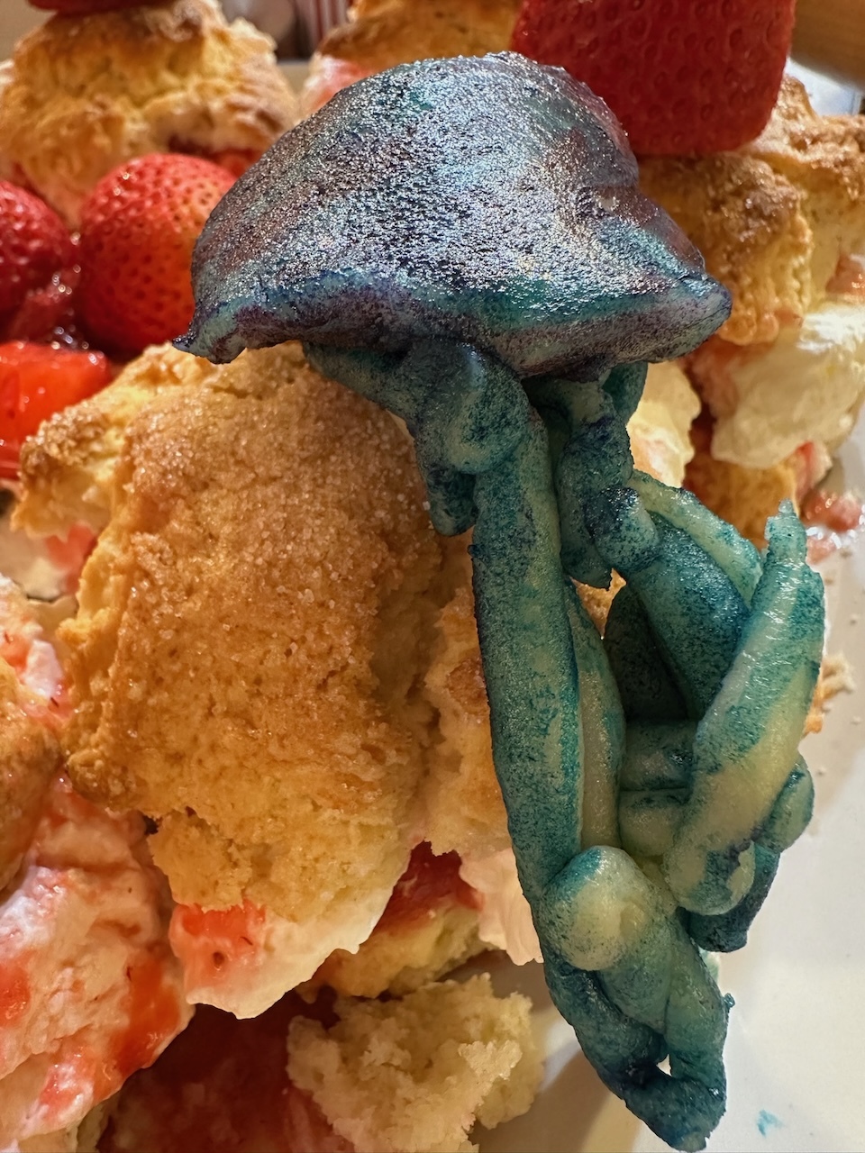 My father's birthday will be formally observed the next time my niece is in town, but for the day itself my mother and I baked him the chicken and leek pie which we had adapted from its recipe the two days prior that the filling can be stored in the refrigerator to deepen in flavor like a stew and a strawberry shortcake which I am currently proud of decorating with a painted marzipan man o' war after the mosaic in Leonardo Morales y Pedroso's 1930 Casa de Mark A. Pollack y Carmen Casuso.